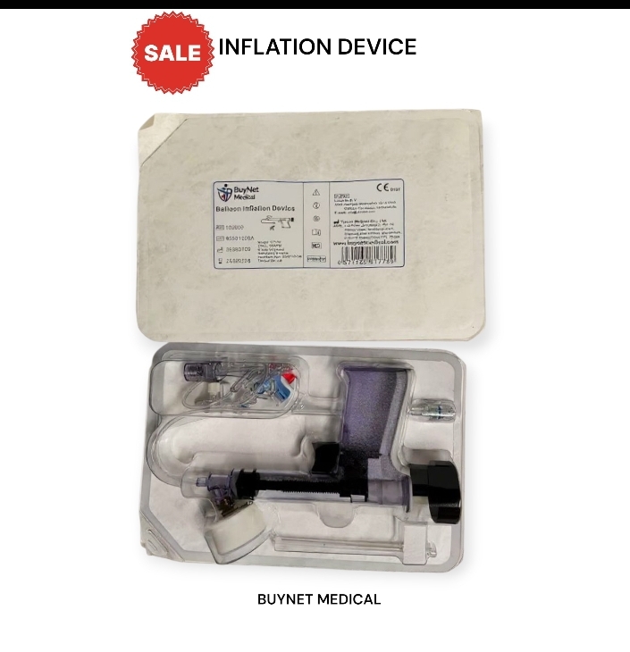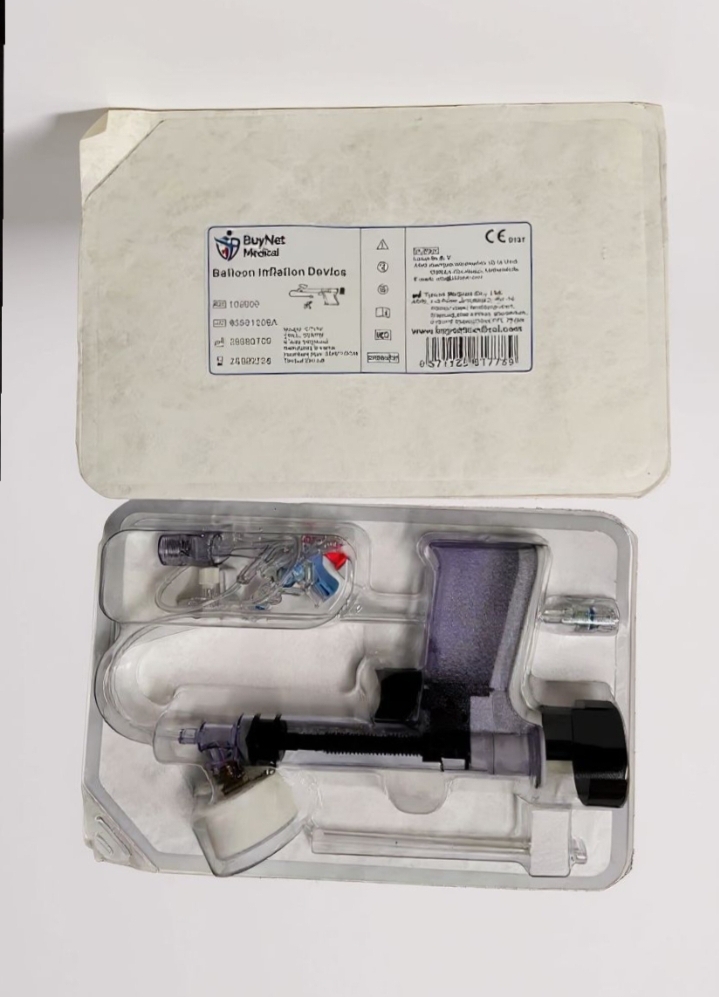 The disposable balloon inflation device is used in PTCA surgery together with balloon catheter. Expand the balloon by operating the balloon inflation device, thereby expand the blood vessel or implant stents inside the vessel.
