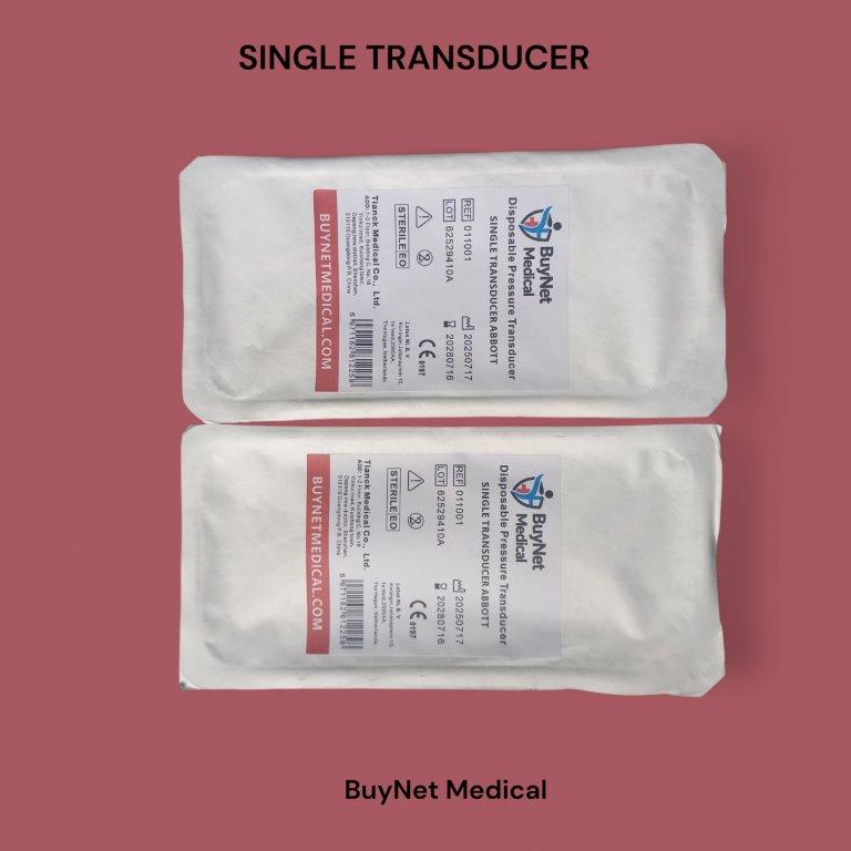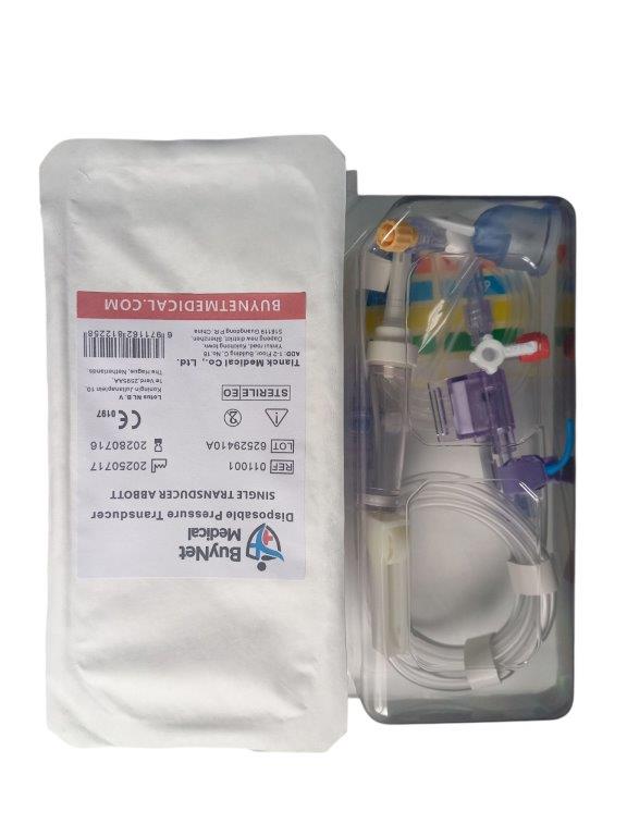 Disposable pressure transducer consist of pressure signals output line, pressure sensing chip, exhaust valve, three way stopcock and exhaust tube. It is used in hospitals to measure the patient's arterial or venous pressure.